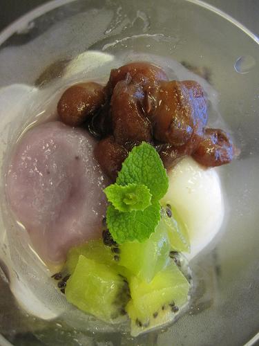 友達の萌ちゃんの 手作りおやつ オリジナルあんみつ 感激 ブルーベリー白玉 オレンジ寒天 牛乳寒・・・ 細かくカットされた キウィ ミントもさわやか 可愛くて美味しいあんみつ 嬉しいね どうもごちそうさまでした