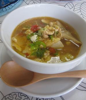 セロリやトマト、たけのこなど、具だくさんのスープ